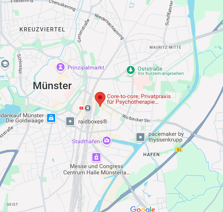 Wir praktizieren therapeutisch sowohl im Dreiraum Münster im Zentrum Münsters (Psychotherapie, Coaching, Paar- und Sexualtherapie, Gruppenangebote) als auch in eigenen Praxisräumen in Münster-Wolbeck (Psychotherapie und Coaching). Wenn Sie eine Standortspräferenz haben, geben Sie diese bitte im Telefonat oder im Kontaktformular an.